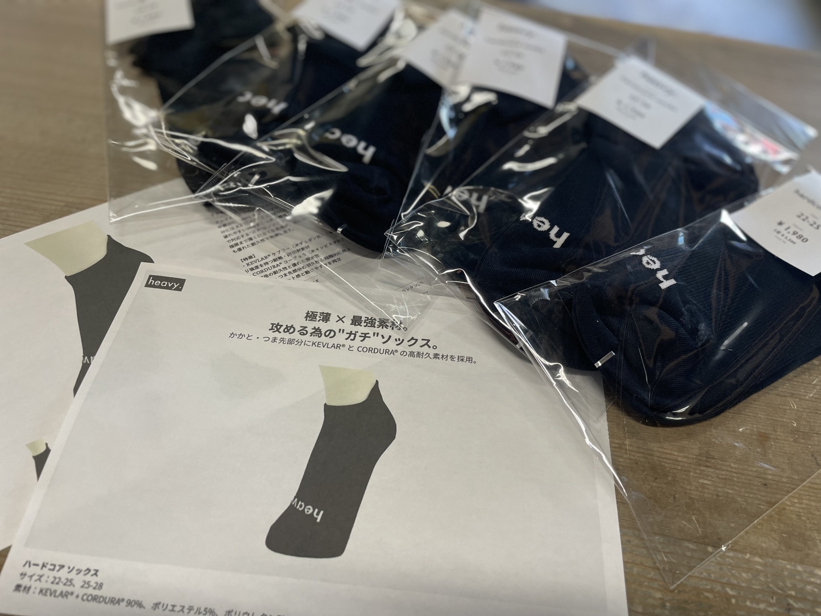 アンクル丈のブラックソックス。甲部分に heavy. のブランドロゴを編み込み、かかと・つま先部分には KEVLAR® と CORDURA® の2大高耐久素材を採用。